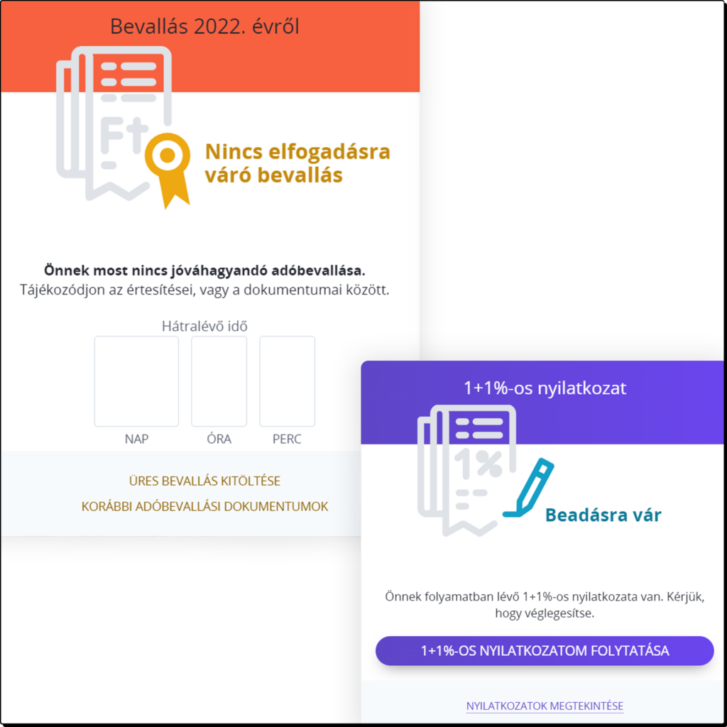 Bejelentkezés után bal oldalon az adóbevallásodat töltheted ki, jobb oldalt pedig a személyi jövedelem adód 1 százalékáról rendelkezhetsz. Ne felejtsd el a bevallásodat átnézni, de most a jobb oldali, lila “1+1%-os nyilatkozatom beadása” vagy “1+1%-os nyilatkozatom folytatása” gombra kattints.